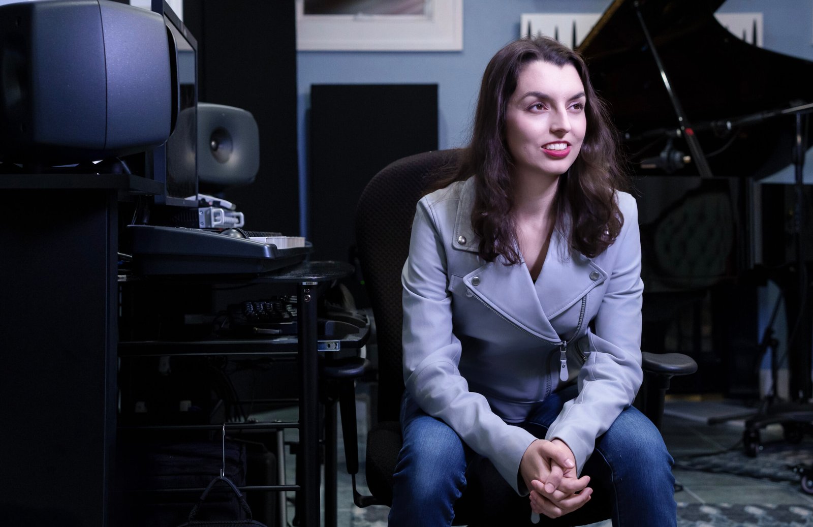 Shelby Lock, a white woman with long brown hair, sitting in her studio in front of her mixing desk with Genelec 8341A speakers, with her grand piano in the background.